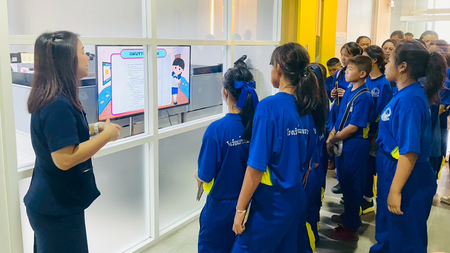 ในการนี้ เจ้าหน้าที่งานสื่อสารองค์กร ให้การต้อนรับและนำเยี่ยมชมกระบวนการผลิตรายการการเรียนการสอนของสถานีฯ ภายใต้การบริหารงานของมูลนิธิฯ เพื่อเป็นการแลกเปลี่ยนเรียนรู้ และเผยแพร่พันธกิจการดำเนินงานของมูลนิธิฯ ให้กับคณะครู นักเรียนปลายทางได้เข้าใจถึงกระบวนการผลิตและจัดการเรียนการสอนจากห้องเรียนต้นทางโรงเรียนวังไกลกังวลฯ ไปยังผู้รับบริการทั่วประเทศ