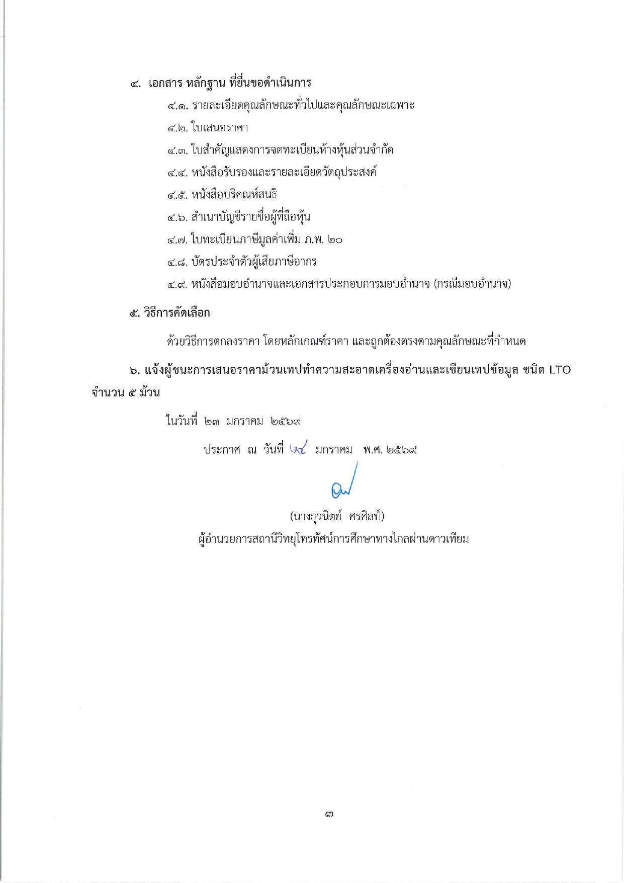 บริษัทผู้สนใจ สามารถยื่นเสนอราคาม้วนเทปทำความสะอาดเครื่องอ่านและเขียนเทปข้อมูลชนิด LTO จำนวน 5 ม้วน และเอกสารหลักฐาน