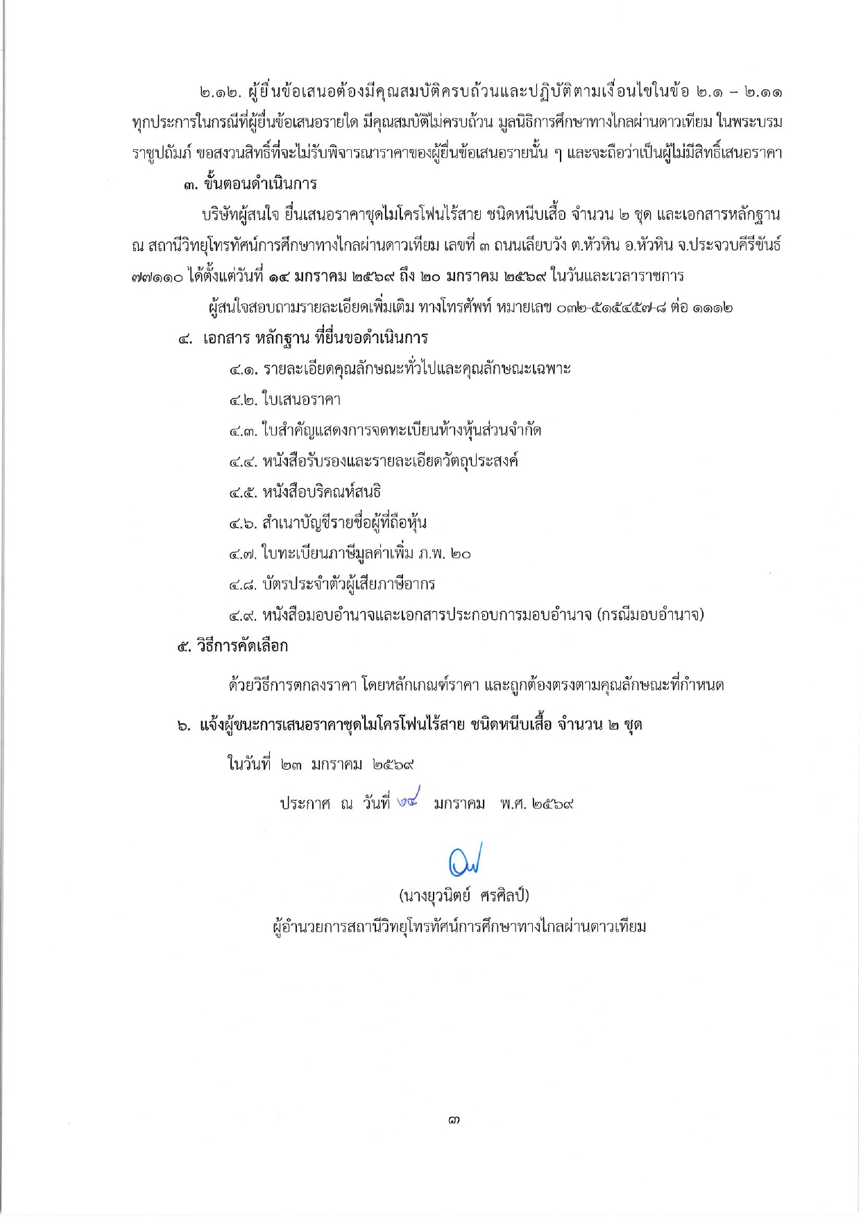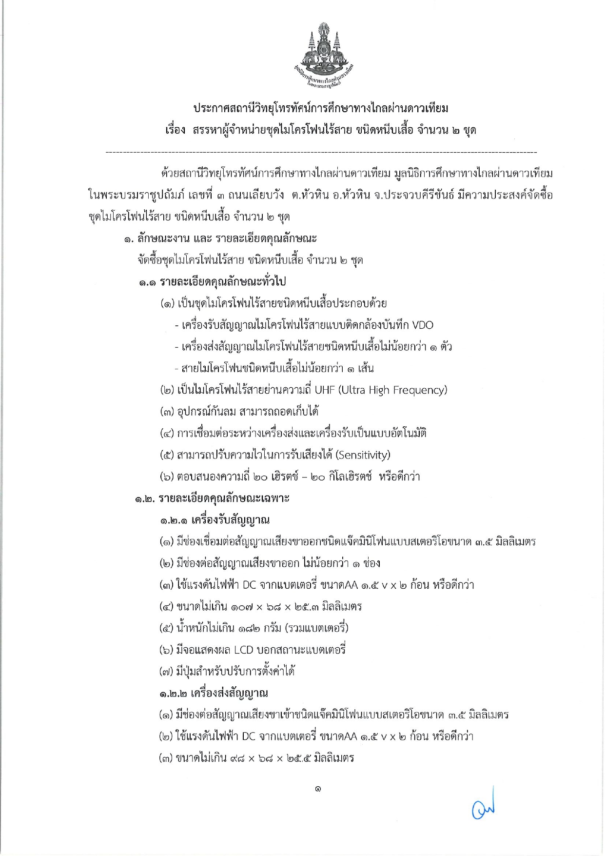 ประกาศสถานีวิทยุโทรทัศน์การศึกษาทางไกลผ่านดาวเทียม เรื่อง สรรหาผู้จำหน่ายชุดไมโครโฟนไร้สาย ชนิดหนีบเสื้อ จำนวน 2 ชุด