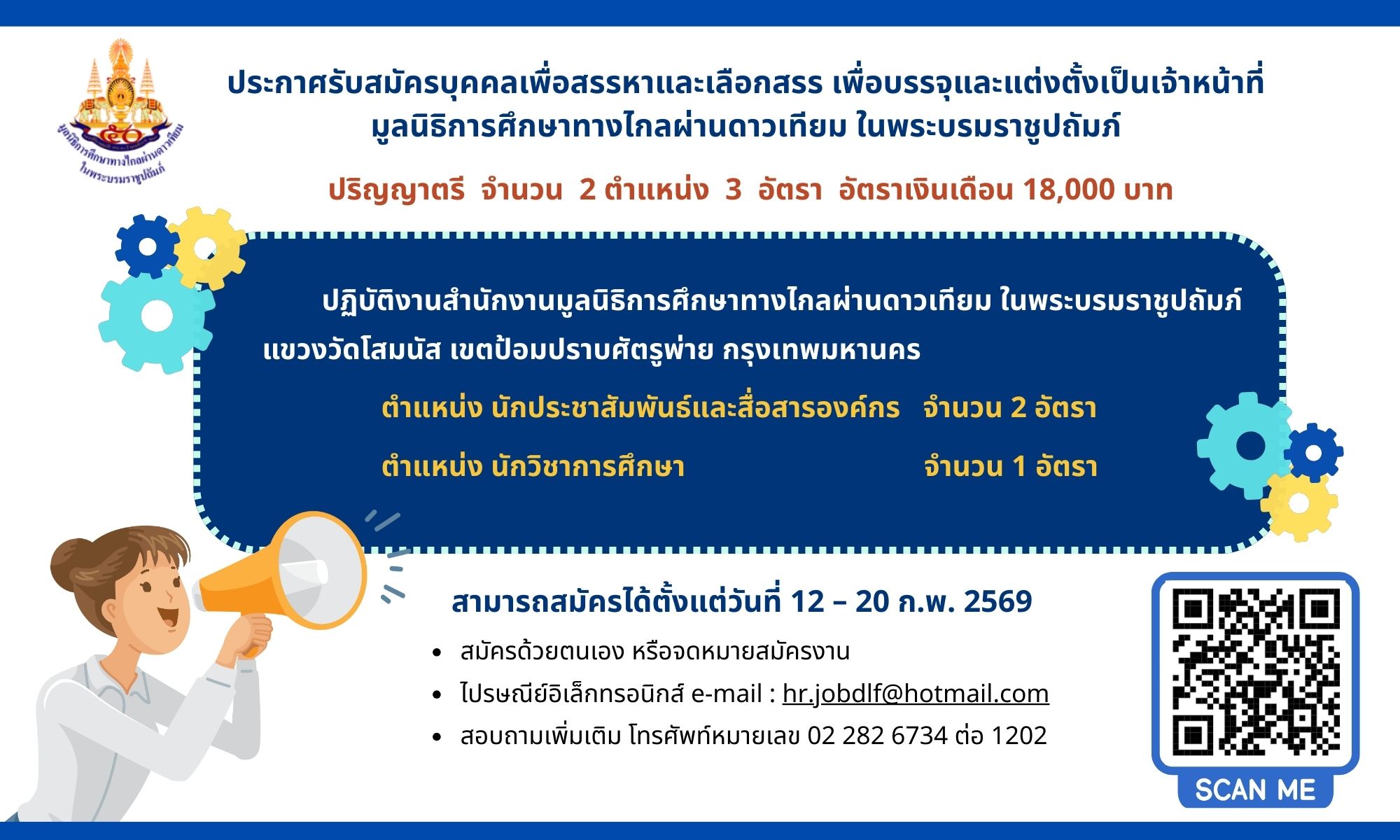 มูลนิธิการศึกษาทางไกลผ่านดาวเทียม ในพระบรมราชูปถัมภ์ เปิดรับสมัครบุคคลเพื่อสรรหาและเลือกสรรเพื่อบรรจุและแต่งตั้งเป็นเจ้าหน้าที่มูลนิธิการศึกษาทางไกลผ่านดาวเทียม ในพระบรมราชูปถัมภ์ วุฒิการศึกษาระดับปริญญาตรี จำนวน 2 ตำแหน่ง 3 อัตรา อัตราเงินเดือน 18,000 บาท
