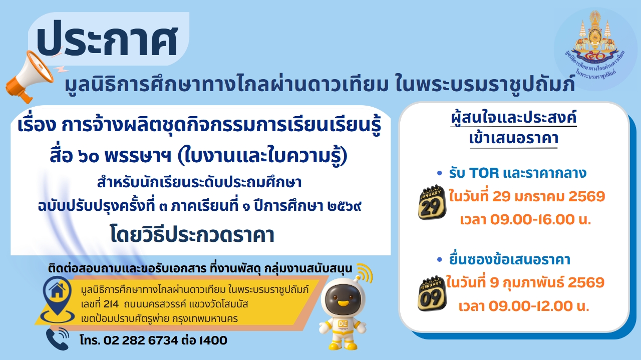 เรื่อง การจ้างผลิตชุดกิจกรรมการเรียนรู้ สื่อ 60 พรรษาฯ (ใบงานและใบความรู้) สำหรับนักเรียนระดับประถมศึกษา ฉบับปรับปรุงครั้งที่ 3 ภาคเรียนที่ 1 ปีการศึกษา 2569 โดยวิธีประกวดราคา