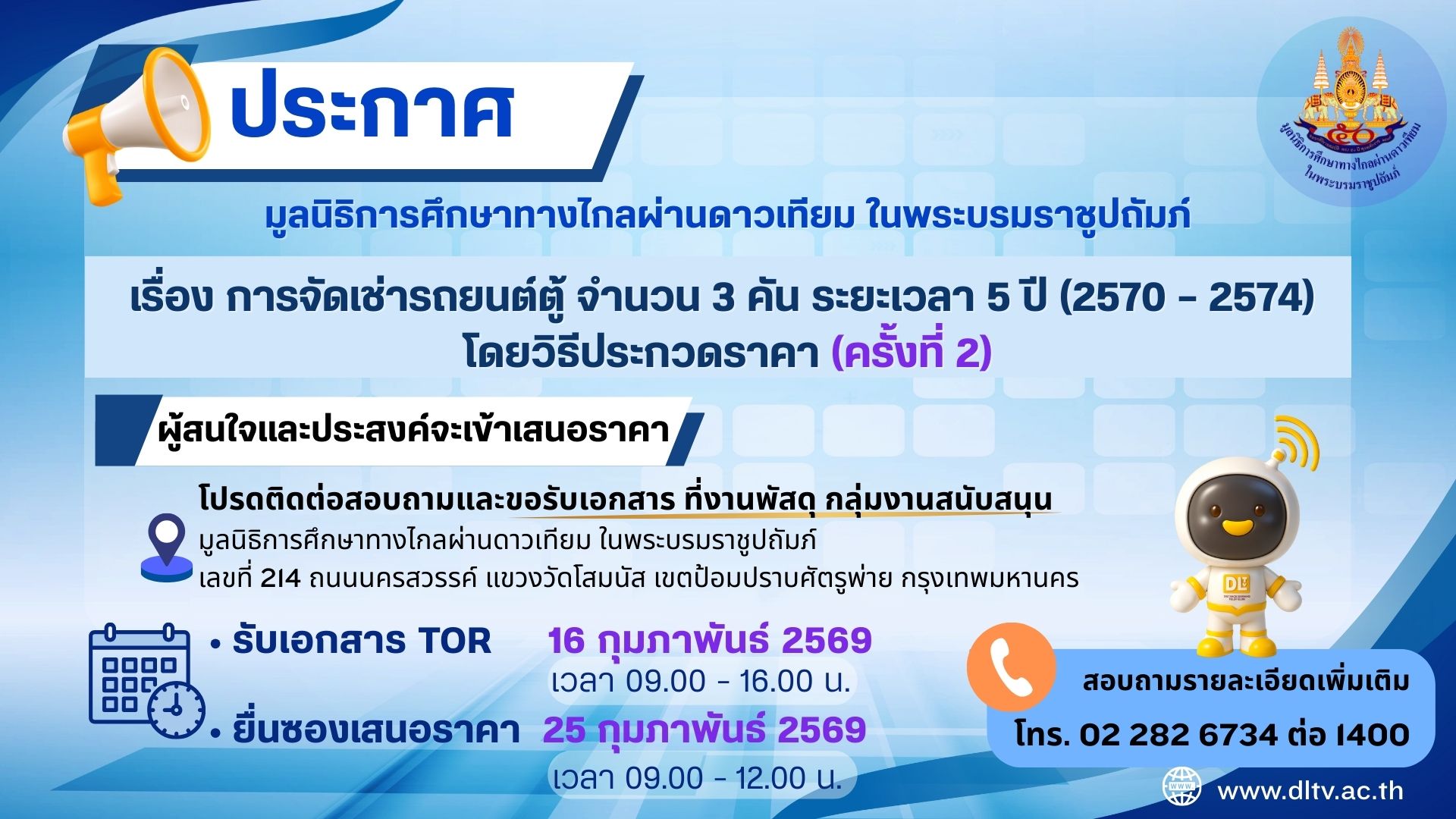 เรื่อง การจัดเช่ารถยนต์ตู้ จำนวน 3 คัน ระยะเวลา 5 ปี (2570 – 2574) โดยวิธีประกวดราคา (ครั้งที่ 2)