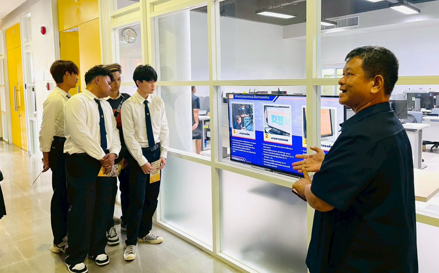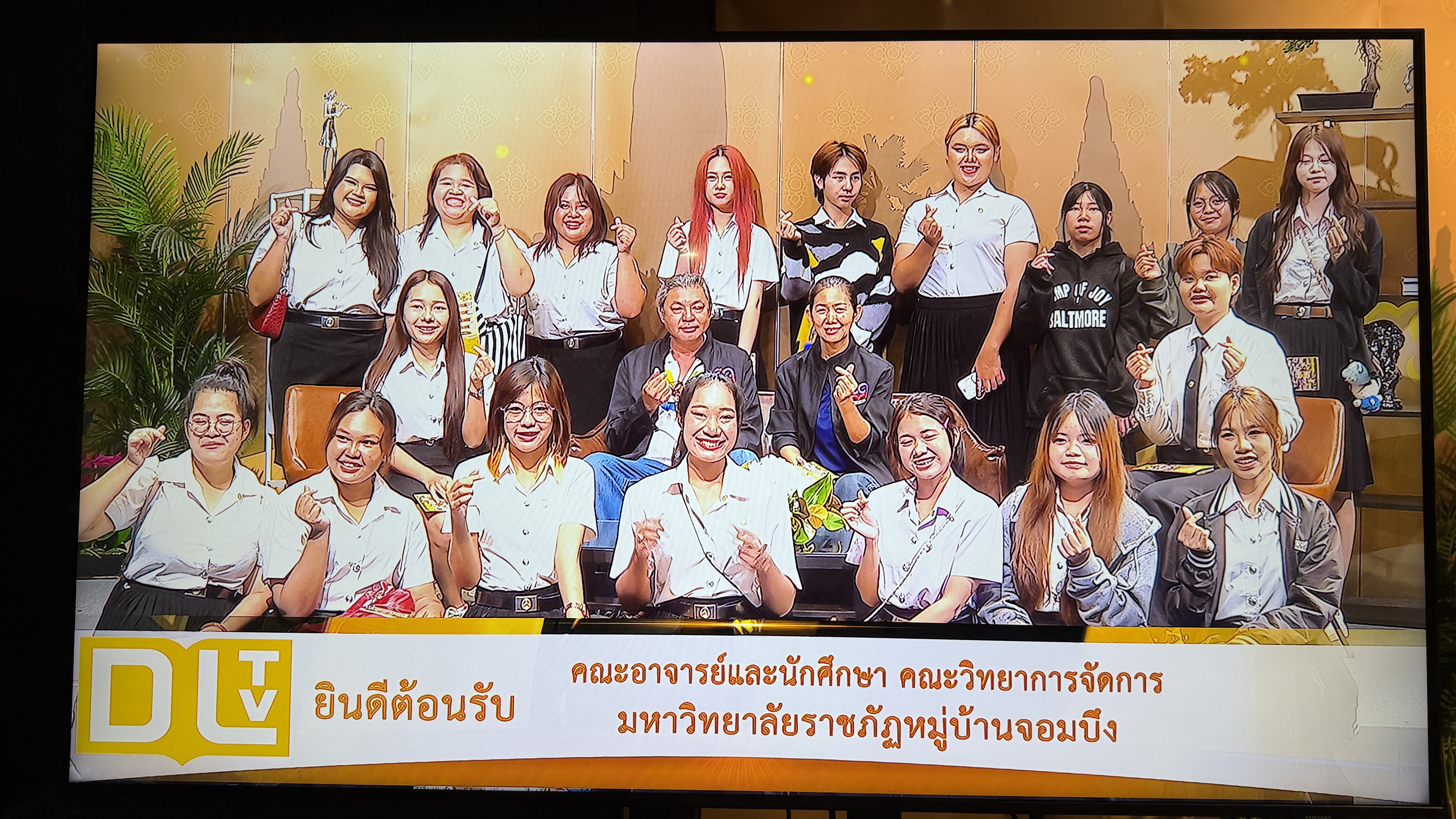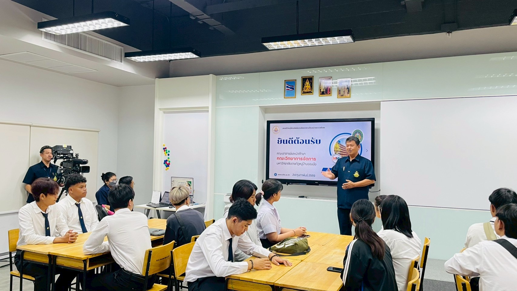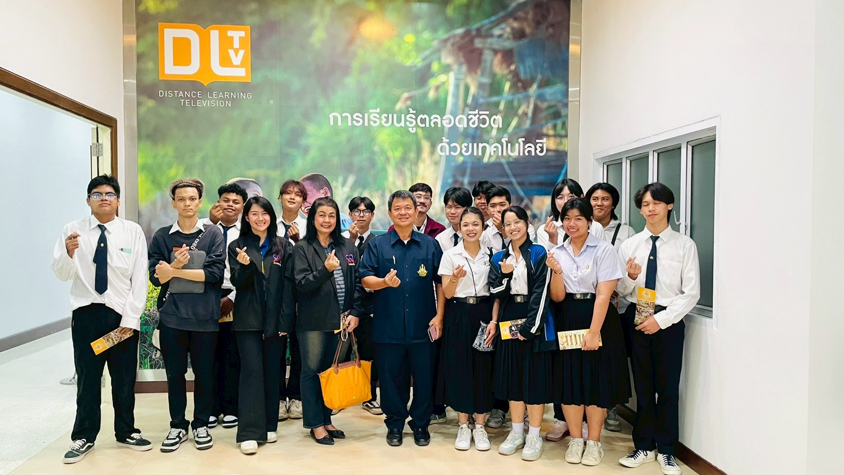 วันอังคารที่ 24 กุมภาพันธ์ 2569 เวลา 10.00 น. นายณัฐพงษ์ สวัสดี หัวหน้าฝ่ายสารสนเทศและสื่อสารองค์กร พร้อมด้วย นายก้องเกียรติ ส่องแสงจันทร์ หัวหน้าฝ่ายผลิตรายการ และนายอมรเทพ สุกสี หัวหน้าฝ่ายออกอากาศ ให้การต้อนรับคณะอาจารย์และนักศึกษา สาขาวิชานิเทศศาสตร์และนวัตกรรมสื่อ คณะวิทยาการจัดการ มหาวิทยาลัยราชภัฏหมู่บ้านจอมบึง จำนวน 42 คน ในโอกาสเข้าศึกษาดูงาน ณ สถานีวิทยุโทรทัศน์การศึกษาทางไกลผ่านดาวเทียม โดยคณะได้เยี่ยมชมกระบวนการผลิตรายการการเรียนการสอนทางไกลผ่านดาวเทียม (DLTV) ตั้งแต่ห้องเรียนต้นทาง ระดับชั้นมัธยมศึกษาปีที่ 1–3 ,ห้องควบคุมบันทึกรายการ ,ห้องควบคุมการออกอากาศ ,ห้องตัดต่อรายการ ,ห้องบันทึกรายการฉากจริง ,ห้องบันทึกรายการฉากเสมือนจริง และห้องนิทรรศการ DLTV