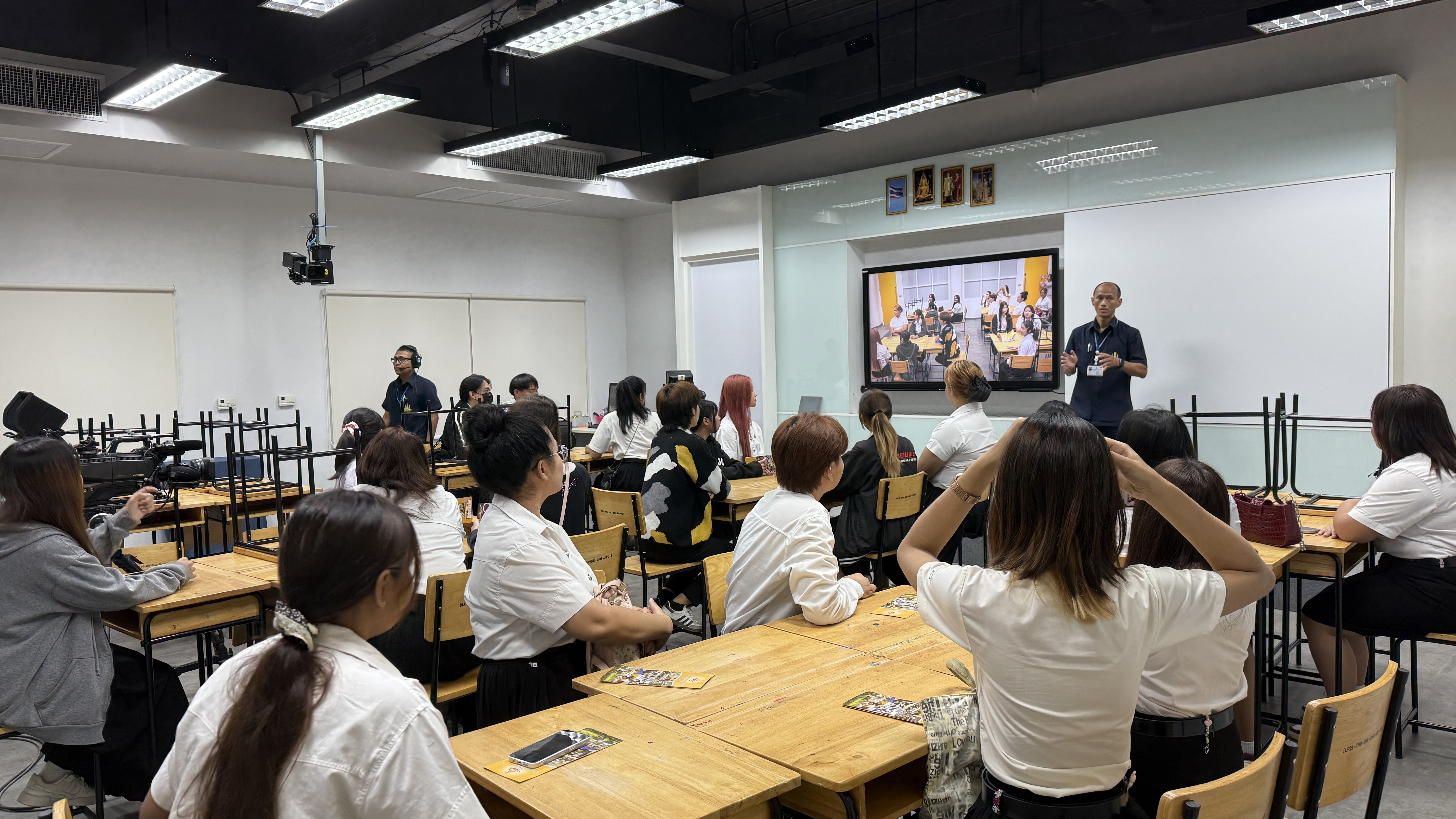 จากนั้น คณะรับชมวีดิทัศน์และรับฟังการบรรยายสรุปผลการดำเนินงานด้านการจัดการเรียนการสอนทางไกลผ่านดาวเทียม ณ ห้องประชุม ชั้น 3 เพื่อเสริมสร้างความรู้ ประสบการณ์ และเตรียมความพร้อมในการประกอบวิชาชีพด้านสื่อสารมวลชนในอนาคต