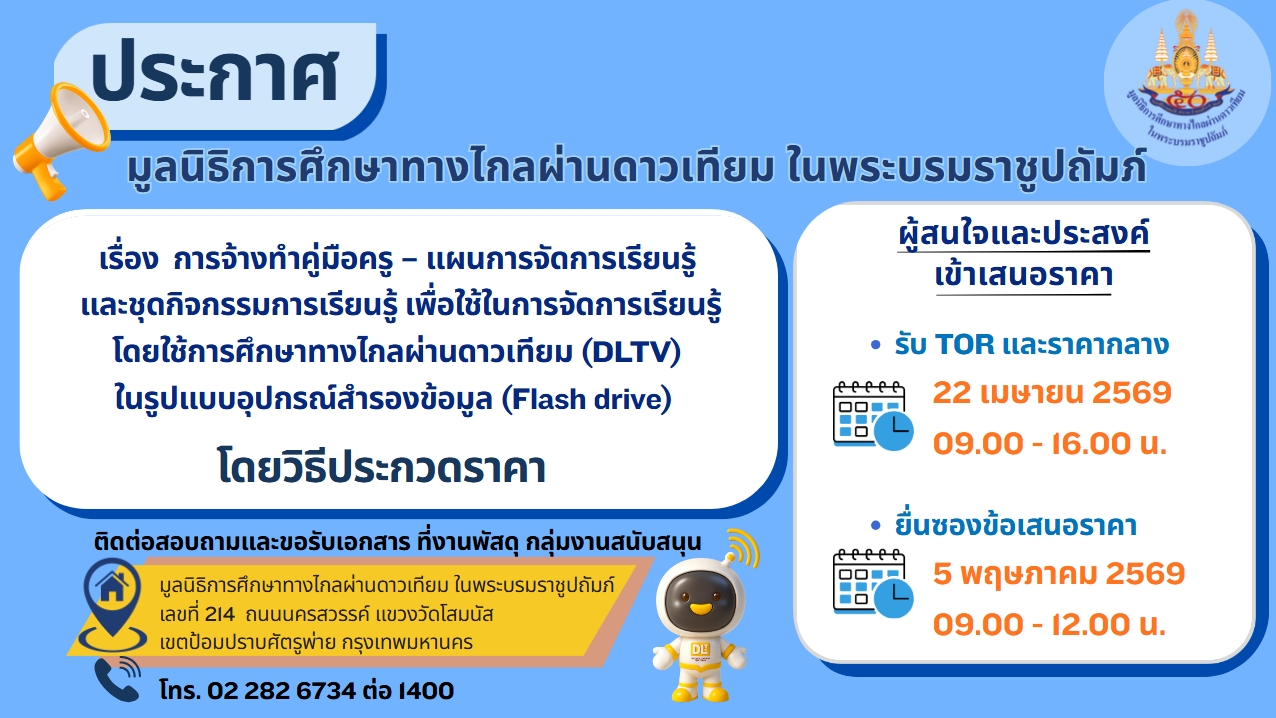 เรื่อง การจ้างทำคู่มือครู – แผนการจัดการเรียนรู้ และชุดกิจกรรมการเรียนรู้ เพื่อใช้ในการจัดการเรียนรู้ โดยใช้การศึกษาทางไกลผ่านดาวเทียม (DLTV) ในรูปแบบอุปรกณ์สำรองข้อมูล (Flash drive) โดยวิธีการประกวดราคา