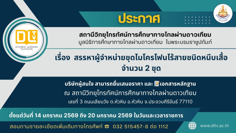 ประกาศสถานีวิทยุโทรทัศน์การศึกษาทางไกลผ่านดาวเทียม เรื่อง สรรหาผู้จำหน่ายชุดไมโครโฟนไร้สาย ชนิดหนีบเสื้อ จำนวน 2 ชุด