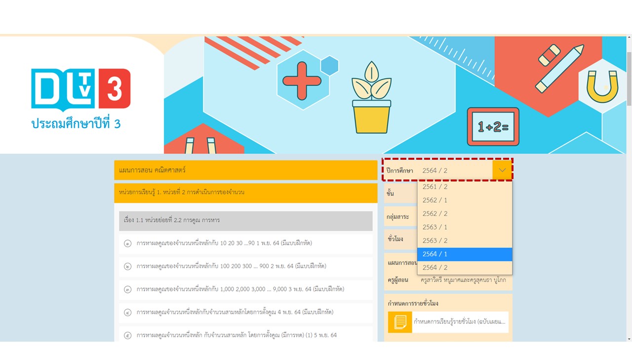 ขอบคุณสำหรับคำแนะนำและการติดตามรับชมการศึกษาทางไกลผ่านดาวเทียม (DLTV) ขณะนี้วิดีโอและสื่อประกอบการสอน ภาคเรียนที่2/2564 อยู่ระหว่างดำเนินการนำขึ้นเว็บไซต์ก่อนออกอากาศตามตารางสอนล่วงหน้า 3 วัน หากต้องการรับชมย้อนหลังของปีการศึกษา 1/2564 แนะนำกดเลือกปีการศึกษาด้านบนขวามือ (ภาพประกอบ) ขอบคุณค่ะ