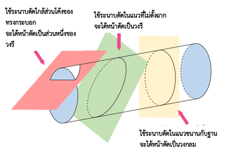 นักเรียนสามารถเขียนภาพและอธิบายลักษณะของหน้าตัดที่ได้จากการตัดรูปเรขาคณิตสามมิติด้วยระนาบในตำแหน่งและทิศทางที่กำหนดให้