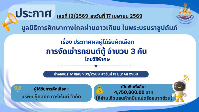 ประกาศผลผู้ได้รับคัดเลือก การจัดเช่ารถยนต์ตู้