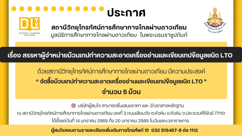 ผู้สนใจ สามารถยื่นเสนอราคา และเอกสารหลักฐาน สถานีวิทยุโทรทัศน์การศึกษาทางไกลผ่านดาวเทียม ตั้งแต่วันที่ 14 มกราคม 2569 ถึง 20 มกราคม 2569 ในวันและเวลาราชการ